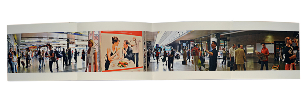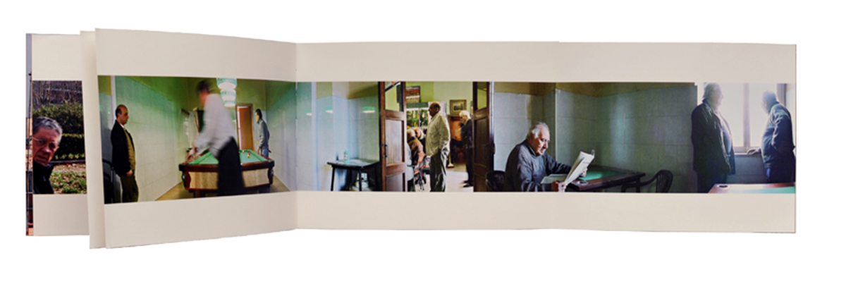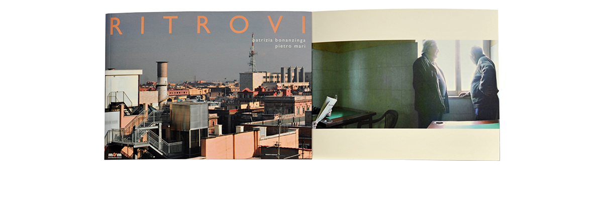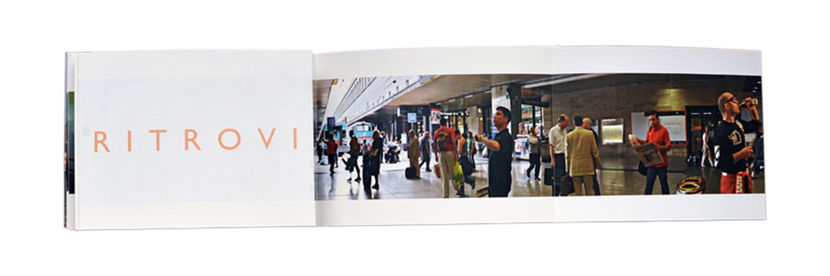 Ad una prima vista fugace, le composizioni fotografiche della serie Ritrovi paiono riprese comuni di scenari urbani di interni e di esterni, momenti quotidiani tratti con la rapidità dello scatto. Le loro dimensioni, però, allungate marcatamente in orizzontale — quasi a sembrare strisce stampate di fotogrammi di un film — chiamano a osservazioni più attente. Vi si avverte come lo svolgersi di racconti, condotti secondo processi ben più dilatati che non quello reso dall’immediatezza dell’istante fotografico. In queste immagini vi è un che di sospeso, di tempo lento; un tempo che rimanda piuttosto a quello proprio della pittura, allungato e meditativo, selezionatore, che ordina e dispone brani di realtà dando forma a visioni interiori.